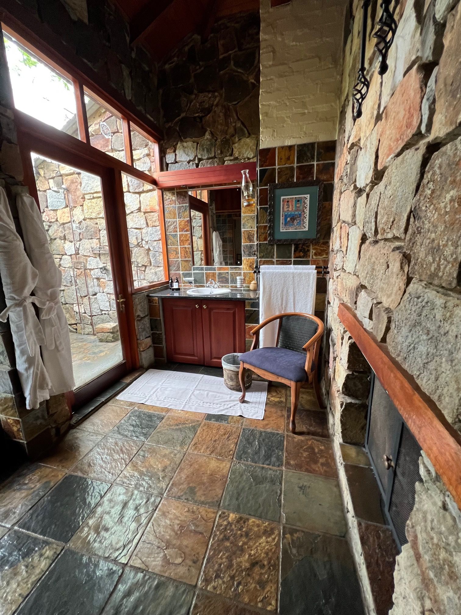 With a total of 10 rooms strategically scattered between Heys Lodge and Bakoni Forest Lodge, the room allocation can be divided between the two lodges. All ten bedrooms are furnished to the same standard and have similar proportions, occupying some 60m² of bedroom, dressing room, bathroom, outdoor shower and veranda. All have fireplaces, most having fires in the bathrooms too. All rooms have private verandas and have either mountain, river or bush views. The twin outdoor showers have remained a highlight since the lodge was built in the last century - 1999.